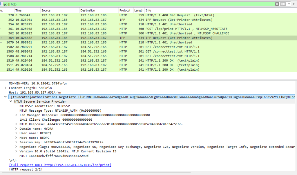 Рис. 15. Прохождение NTLM аутентификации на IPP устройстве
