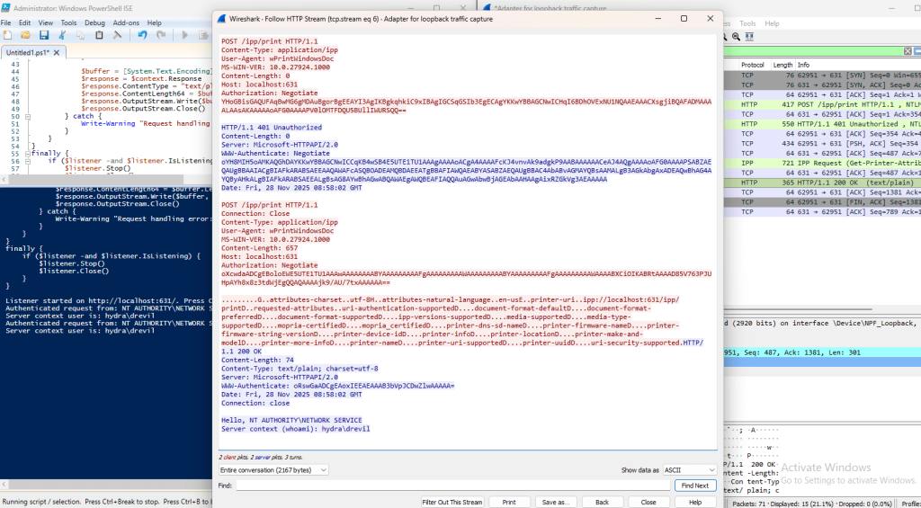 Как мы видим, если наш сервер в ответ на POST запрос к каталогу /ipp/printer возвращает ответ HTTP/1.1 401 Unauthorized, то клиент (наш Windows 11) начинает проходить NTLM-аутентификацию от имени служебной учетной записи NT AUTHORITY\NETWORK SERVICE.