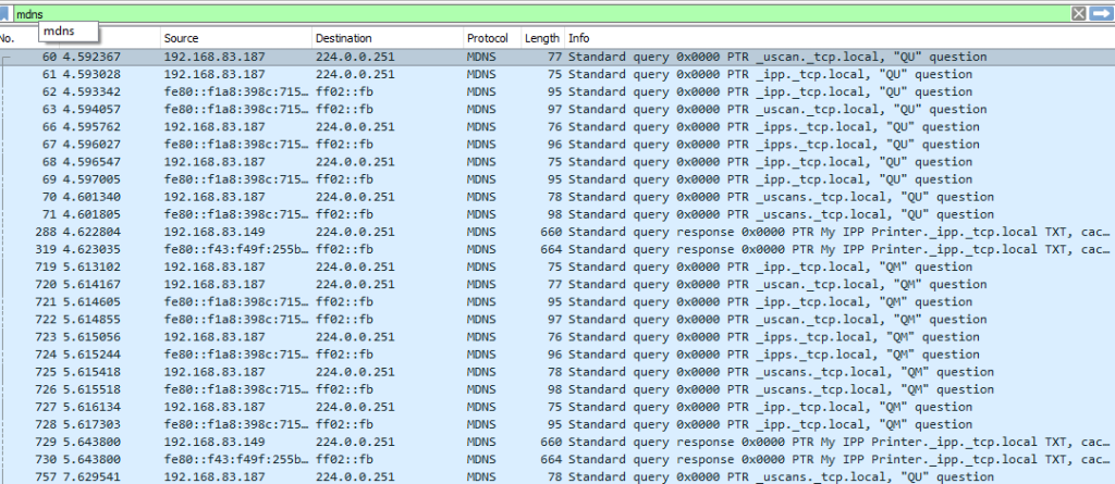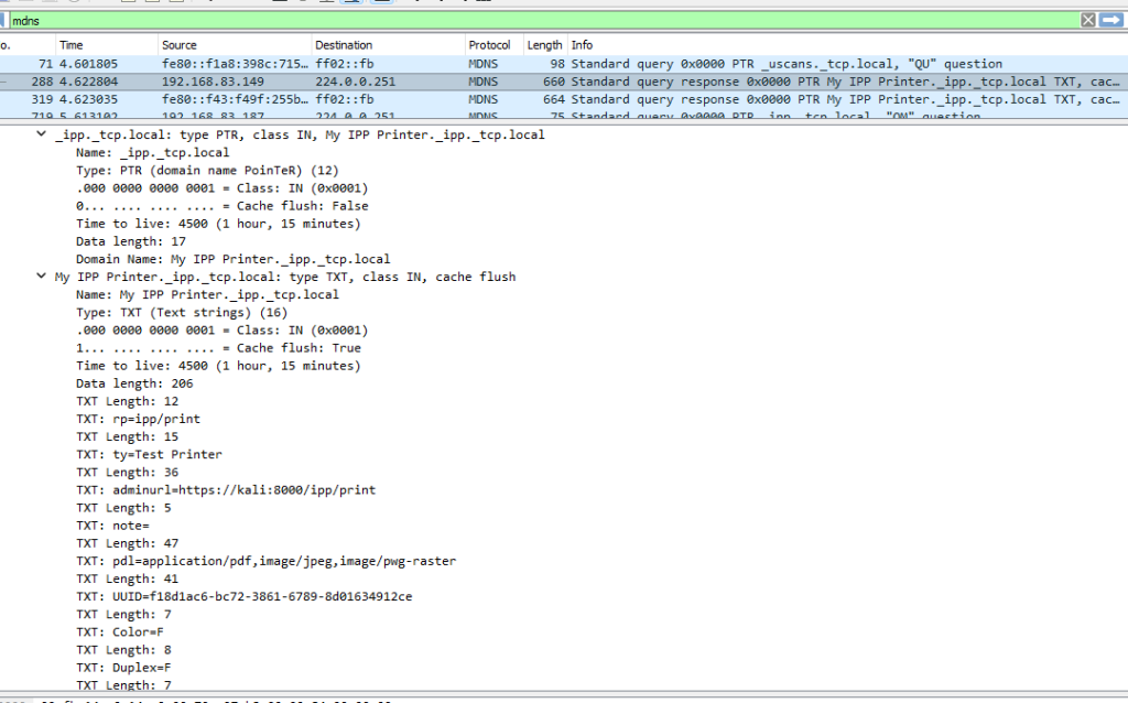 Нас интересует, что для поиска устройств IPP в сети хост рассылает mDNS запросы с указанием нужного PTR _ipp._tcp.local. Если такое устройство в сети есть, оно ответит информацией о своем IP-адресе.