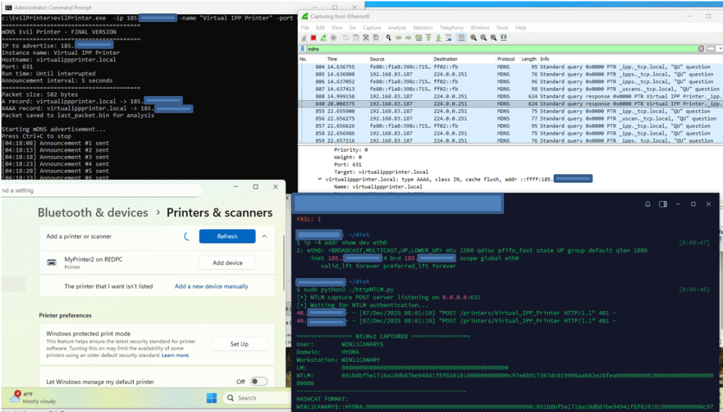 Для демонстрации концепции атаки, мы запустили на VictimHostутилитуevilPrinter.exe, которая отвечает на mDNS запросы PTR _ipp._tcp.local ответами, содержавшими в A-записи IP адрес хоста в сети Internet.
