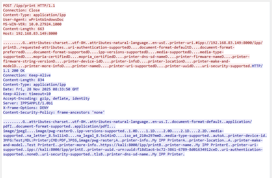 Как мы видим, при подключении к IPP устройству, клиент Windows запрашивает описание устройства – выполняет POST запрос к каталогу /ipp/print. Наш тестовый IPP-принтер настроен на свободный доступ и по умолчанию отправляет техническую информацию о себе.
